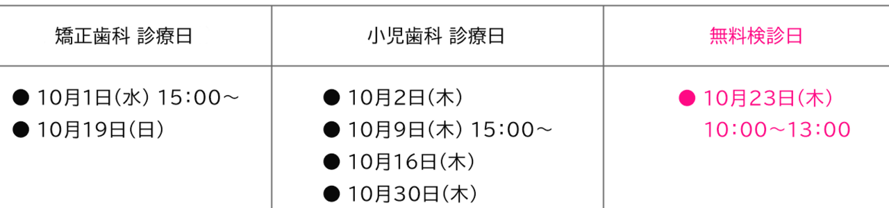 2025年10月の矯正歯科、小児歯科、無料検診の診療日は、下記のとおりです。