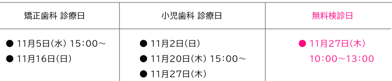 2025年11月の矯正歯科、小児歯科、無料検診の診療日は、下記のとおりです。