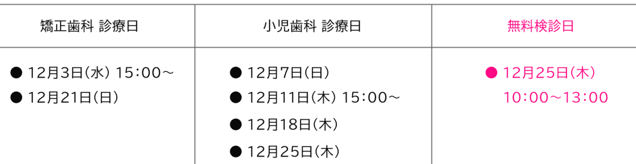 2025年12月の矯正歯科、小児歯科、無料検診の診療日は、下記のとおりです。